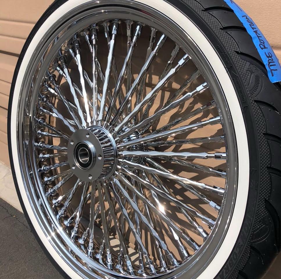 The Mammoth Wheels feature 52 massive stainless steel spokes, a billet hub and a spun steel rim. Available in show chrome, or custom powder coat. All wheels are assembled and tried in house by experienced wheel smiths. Complete your wheel order and we will mount and balance your choice of tires. One year warranty on integrity and chrome. Complete your custom ride with our matching Super Spoke pulleys and rotors.